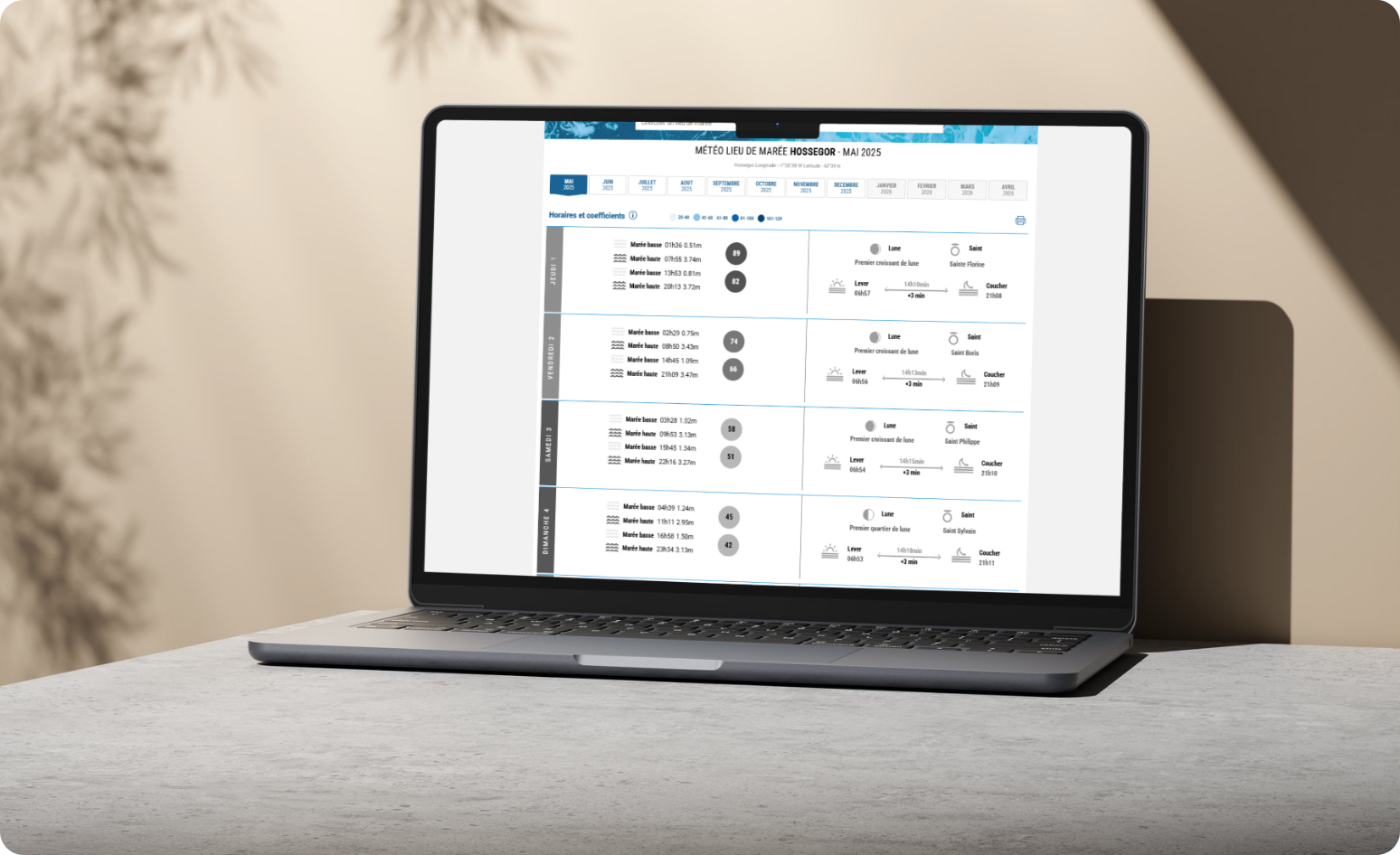 Besides lunar factors, the module also takes the tide coefficient into account. This measures the tide's amplitude, indicating whether the tides will be higher or lower than usual. Based on local data, the module adapts the indicator to anticipate these variations and avoid any mismatch with reality. This allows you to benefit from a reliable reading of the tides, regardless of the time of year.