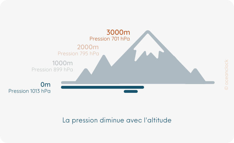 La pression atmosphérique, exprimée en hectopascals (hPa), varie en fonction de plusieurs facteurs, dont l'altitude. Plus on monte en altitude, plus la pression atmosphérique diminue, car la quantité d'air disponible devient plus faible. C'est pourquoi, par exemple, les sommets des montagnes affichent des valeurs de pression nettement inférieures à celles du niveau de la mer.